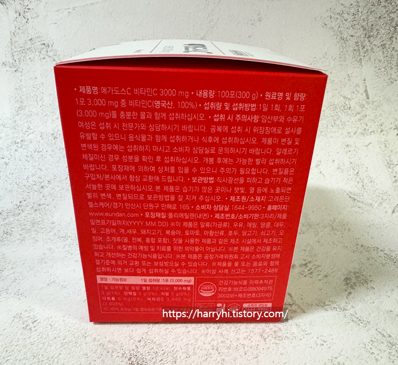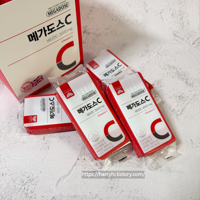 고려은단 메가도스 비타민C 3000mg 하루 한 포를 식중 혹은 식후에 섭취합니다.