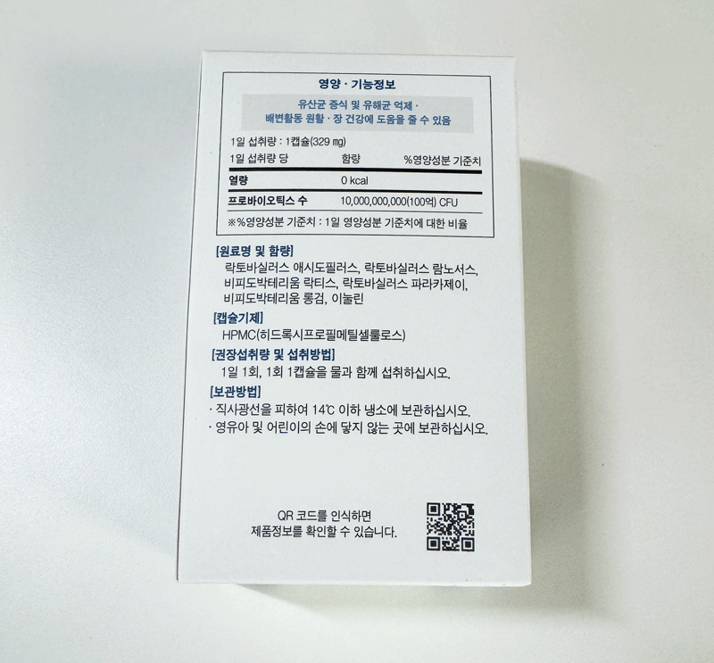 락토바실러스 애시도필러스, 락토바실러스 람노서스, 비피도박테리움 락티스, 락토바실러스 파라카제이, 비피도박테리움 롱검 균주로 50대 미만 성인의 장건강을 위해 조성되어 있다고 합니다. 식약처가 최대 함량으로 권장하는 100억 CFU가 들어있습니다.