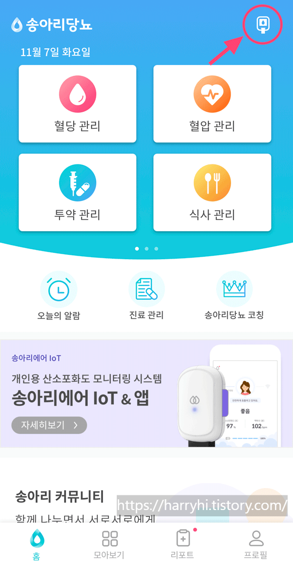 아큐첵으로 혈당을 측정한 후 블루투스로 스마트폰에 결과값을 저장할 수 있습니다. 송아리 당뇨 또는 닥터 다이어리 어플을 사용하는 방법인데요. 그중 송아리 당뇨 어플을 사용해 봤습니다.