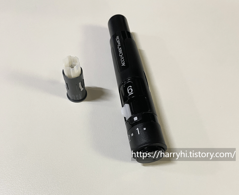 사진 왼쪽에 있는 드럼이라고 하는 작은 기구에 침이 6개가 들어있어요. 처음 아큐첵 가이드와 패스트클릭스 세트 상품을 구매하면 6개짜리 침이 포함되어 있습니다. 매번 침을 교체하지 않아도 된다는 장점 외에도 침이 겉으로 나와있지 않아서 사용하거나 버릴 때 좀 더 안전하다는 점이 좋았습니다. 채혈기 아래쪽에 채혈침을 가리키는 숫자가 표시되어 있어요. 사용후나 사용 전에 버튼을 옆으로 밀어 침을 교체해 주면 됩니다.