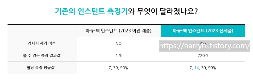 구매할 때 알아본 정보로는 아큐첵 인스턴트 제품은 이전 기록이 1회만 저장되는 반면 가이드 제품은 과거 720회 기록까지 저장된다고 봤었는데요. 최근에 나온 인스턴트 제품은 아큐첵 가이드와 동일하게 720회까지 기록이 저장되는 것 같더라고요.